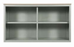 ![]() i sopralzi possono anche essere posizionati a terra, come librerie basse, dotandoli di top di finitura in laminato colore grigio chiaro o noce, oppure in lamiera colore grigio chiaro |